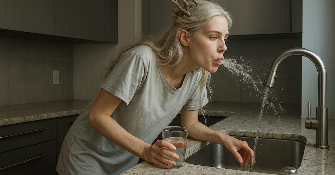 She found the water source by instinct and sound—metal pipes, a lever. But when she grasped it, nothing happened. She twisted, pushed, pulled. Finally, water gushed forth, glittering in a narrow fall.